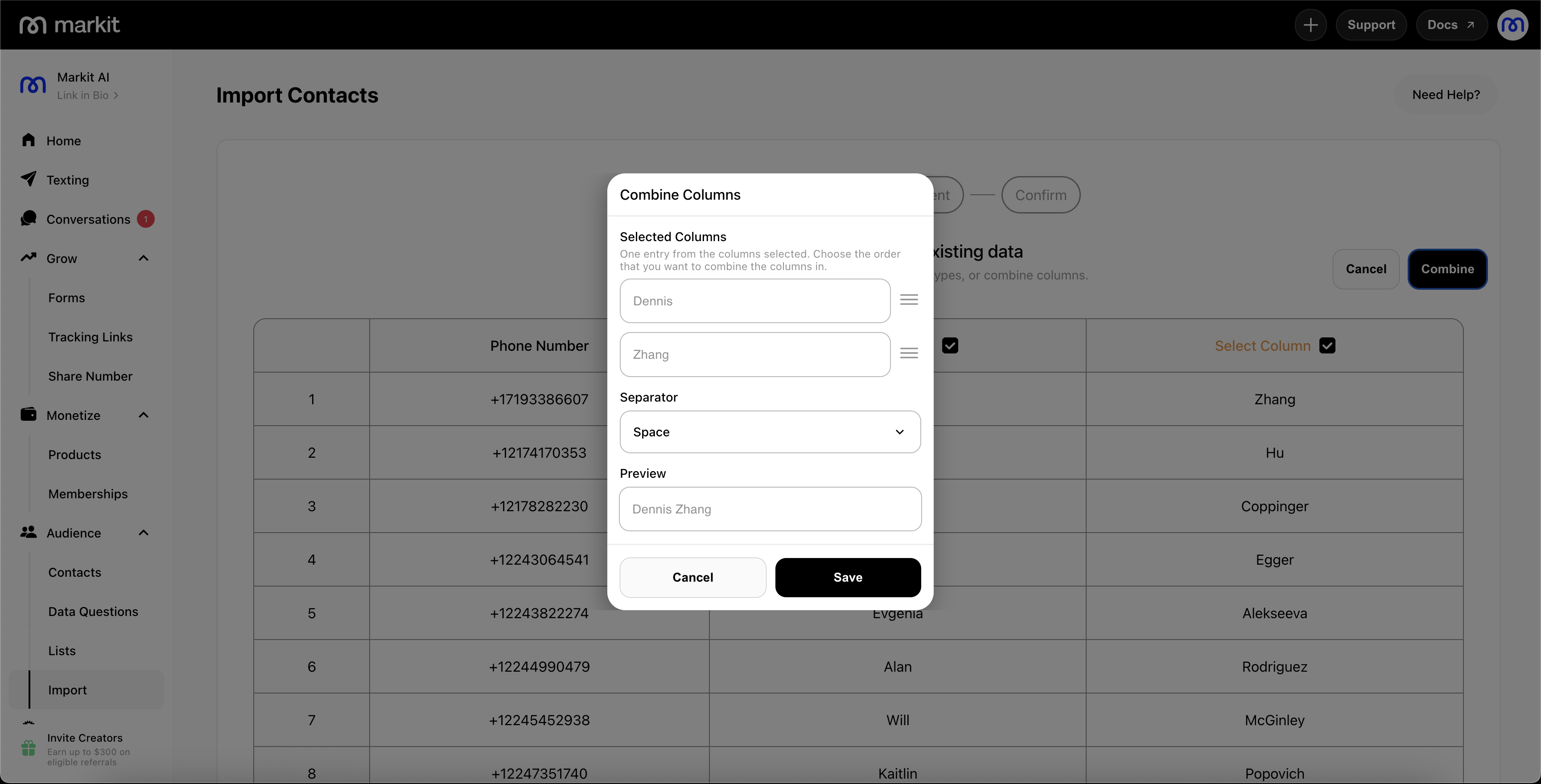 Importing contacts on Markit gives creators the ability to start texting their audience instantly. If you have collected phone numbers in the past, simply format them in a spreadsheet and you can import them all into Markit, automatically adding them to your textable audience.