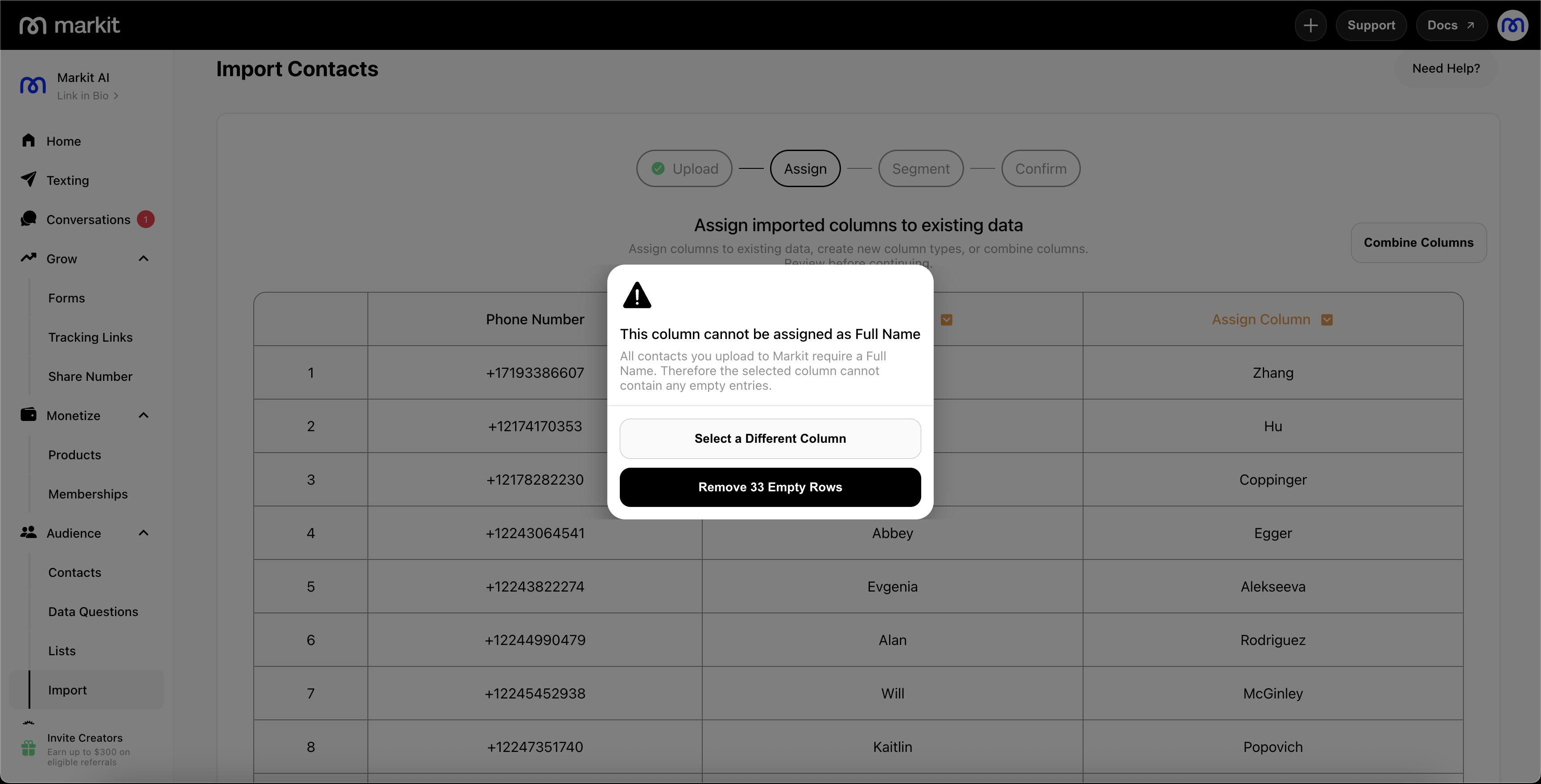 When assigning the full name column, we require that all entries in the selected column are populated and valid. If the selcted column contains empty/invalid entries, you can remove all empty entries by pressing "Remove X Empty Rows". This will clean up and remove the data rows that are invalid so that you can proceed with assigning the full name column.