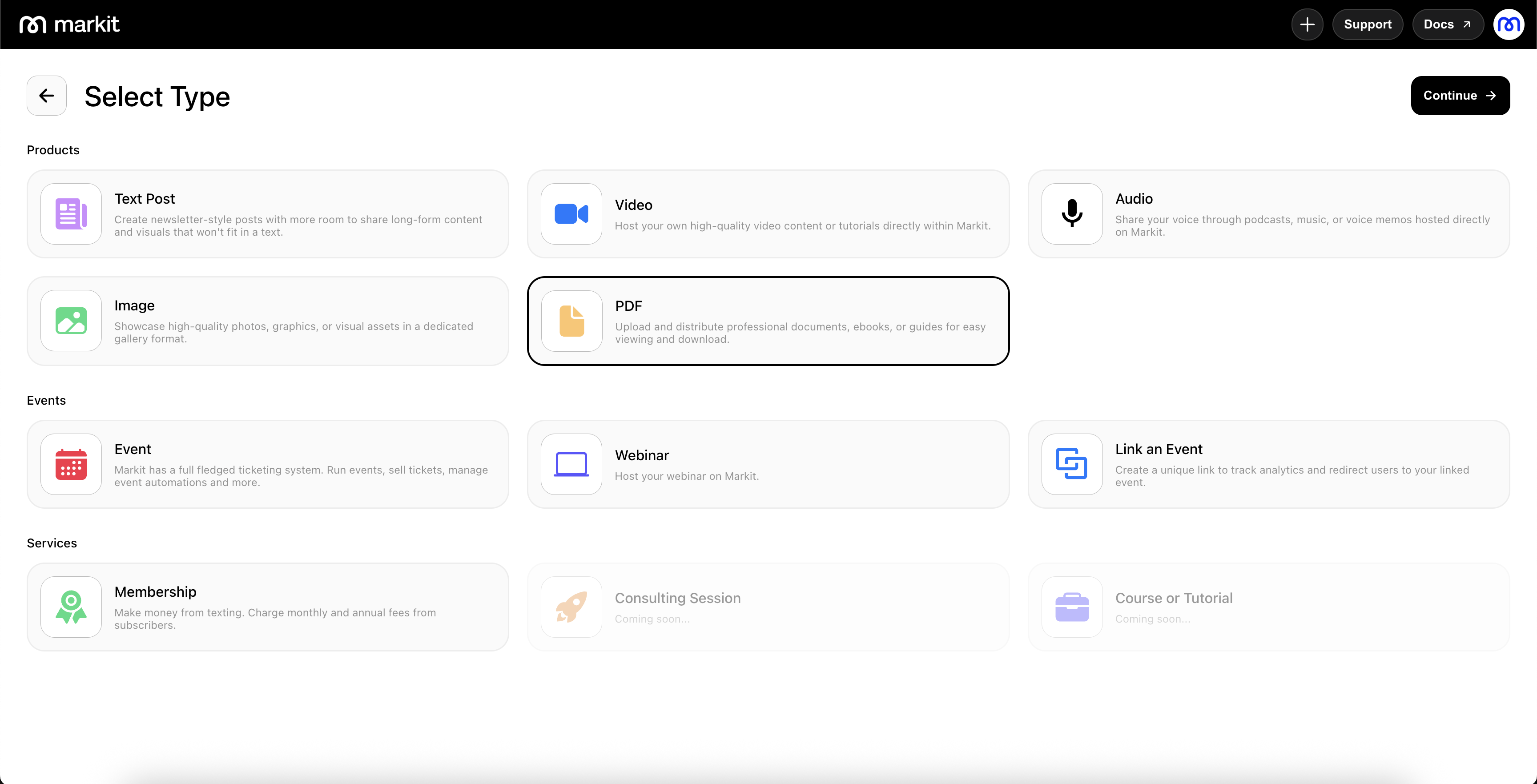 To host a new PDF, go to the Products tab and select "New Product" on the top-right. Then, select the "PDF" option and press "Continue" on the top-right.