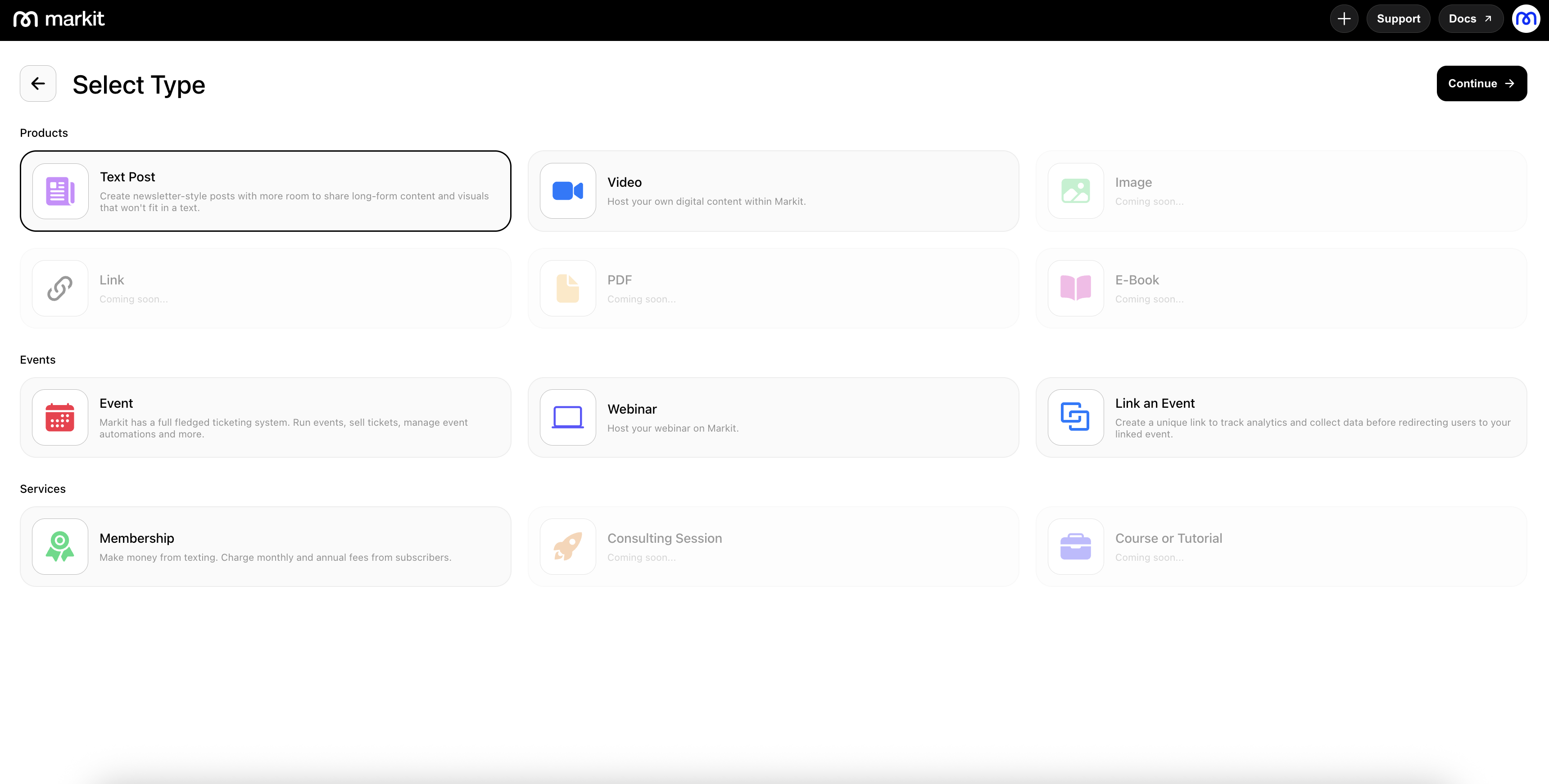 To create a new text post, go to the Products section and click New Product in the top-right corner. This will start a fresh post and take you into the drafting experience.