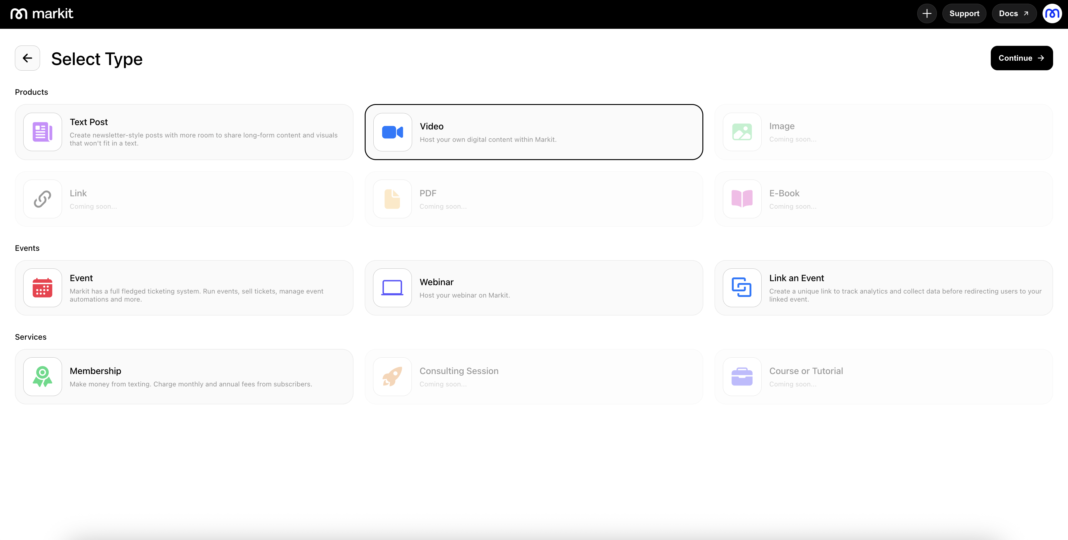 To host a new video, go to the Products tab and select "New Product" on the top-right. Then, select the "Video" option and press "Continue" on the top-right.