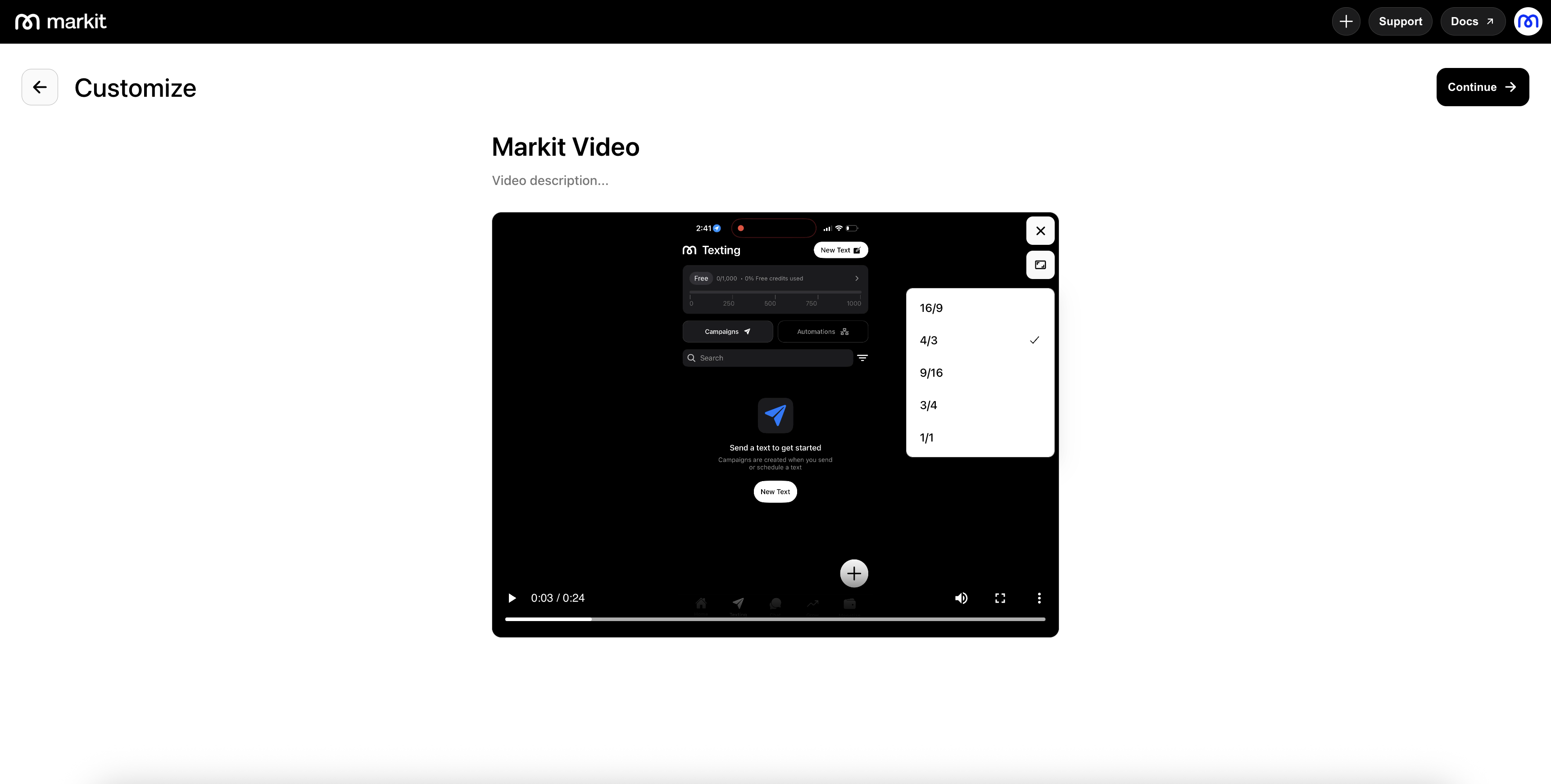 After adding your video, you can preview and play the video. The aspect ratio defaults to the standard format from the video's dimensions, but you can modify the aspect ratio from a set of options. Additionally, on upload, a thumbnail image is generated from the video, providing a screenshot from the start of the video. This can be modified in the next stage.